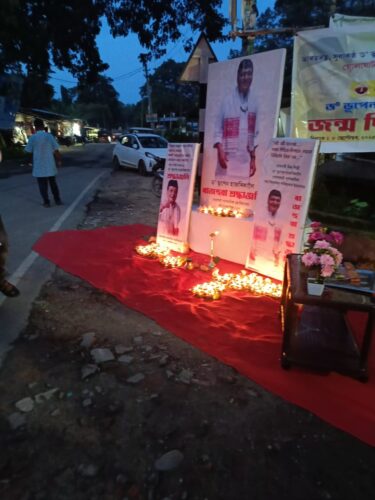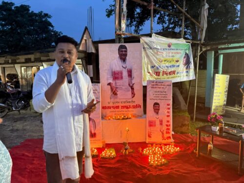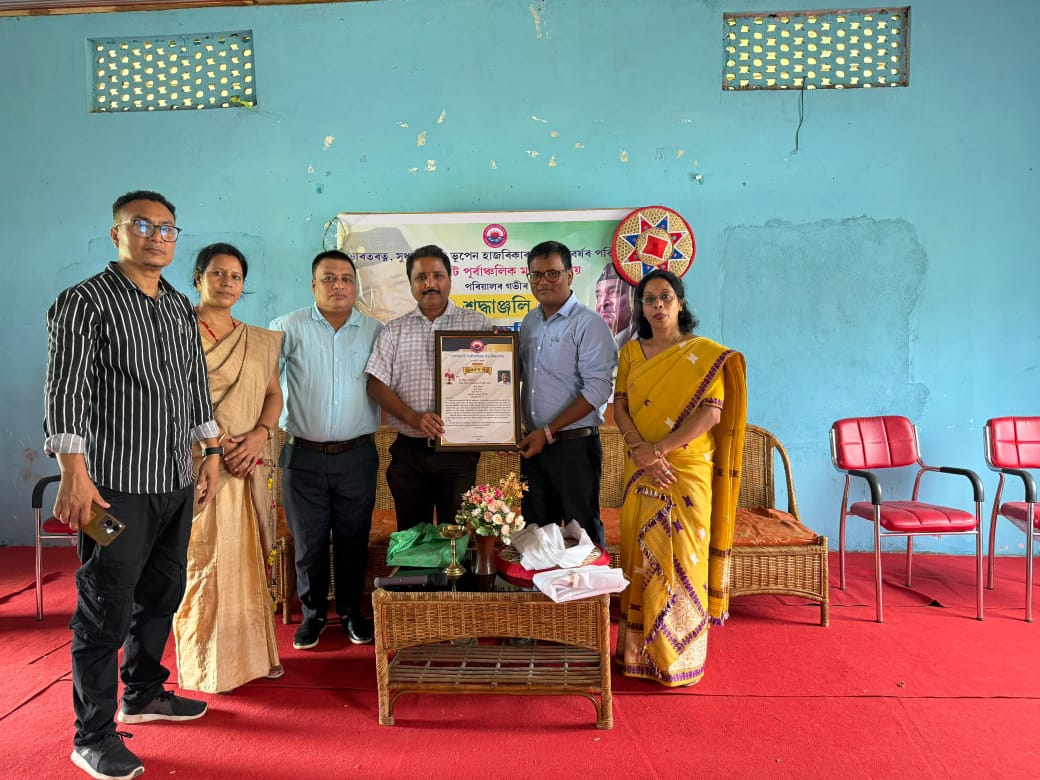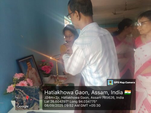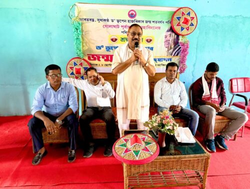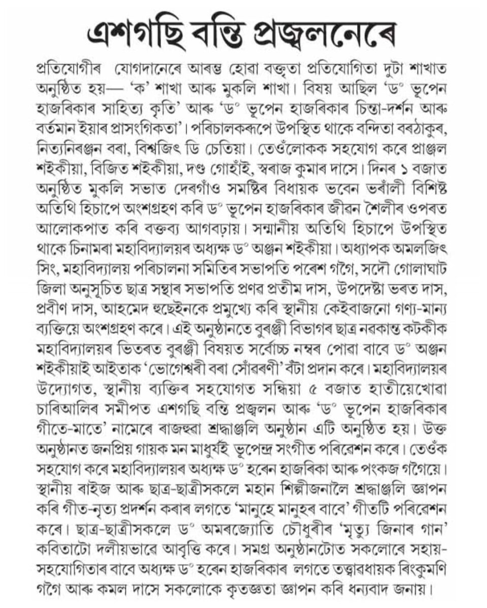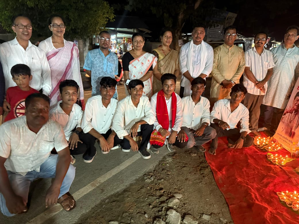 In the evening, a heartfelt tribute was paid through the lighting of 100 lamps at Hatiyekhowa Chariali, followed by a special musical program titled “Geete-Maate”, featuring popular singer Mon Madhujya. The event was supported by Dr. Haren Hazarika, Pankaj Gogoi, and notably organized with the contributions of Kamal Das.