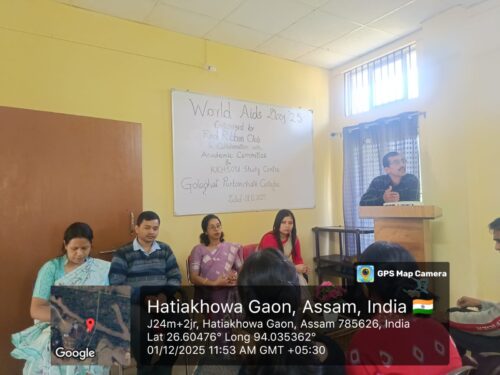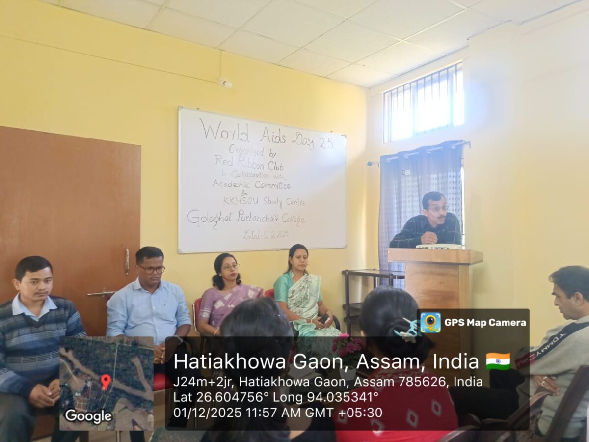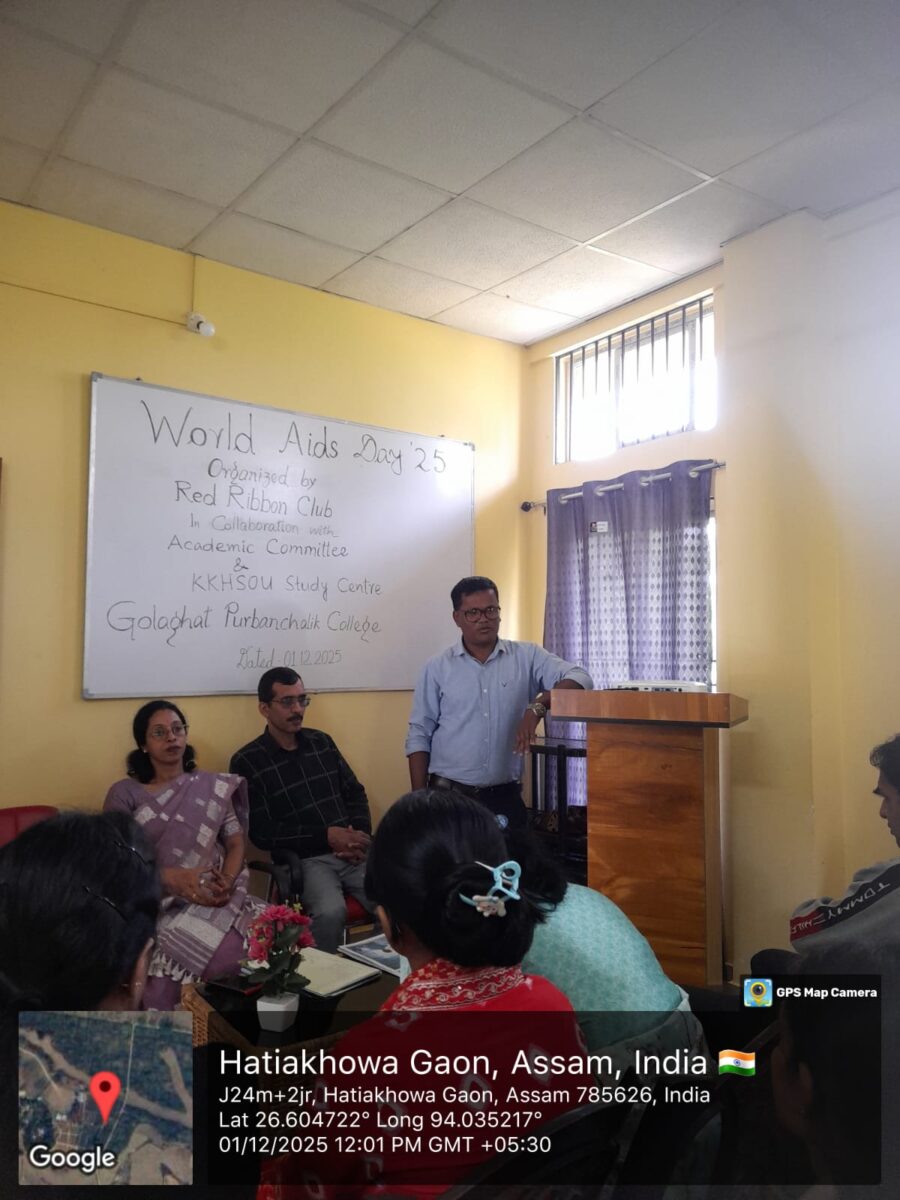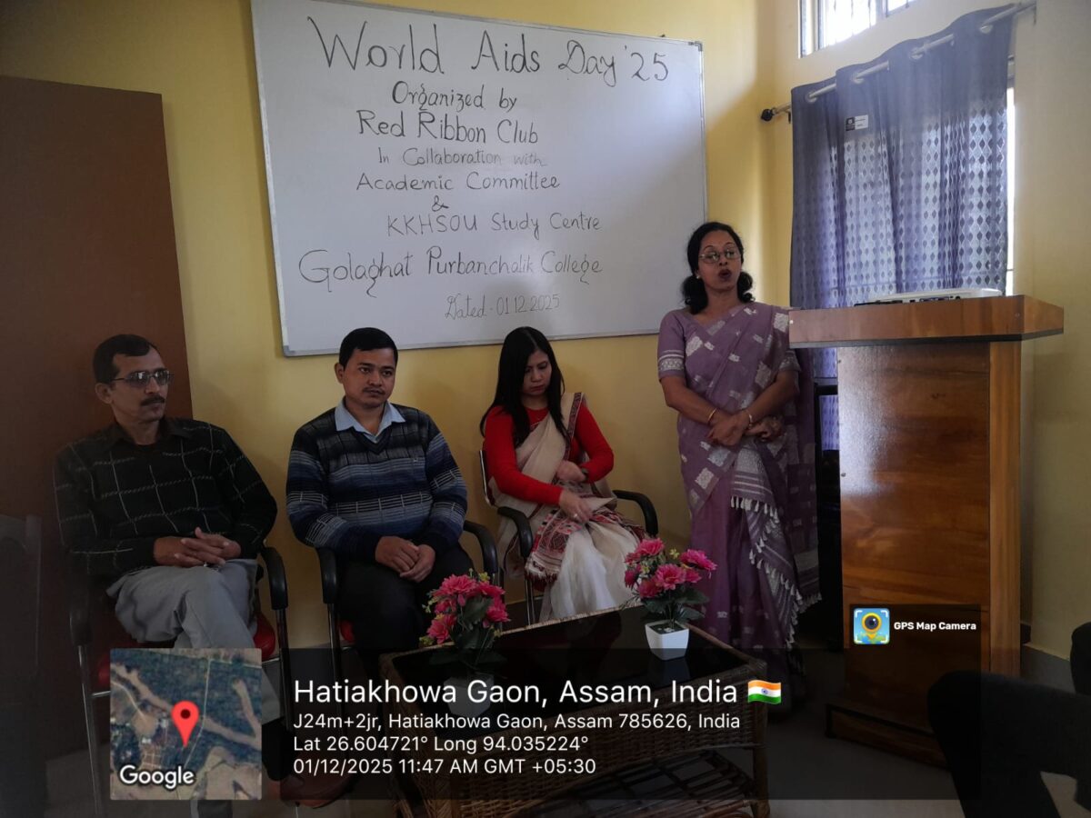 Today, on Monday, 01/12/2025, “WORLD AIDS DAY” was observed at college premises, where the “Red Ribbon Club” has taken initiative in collaboration with the “Academic Committee” and the “KKSHOU Study Centre”. The objective of the programme was explained by Dr. Malamoni Goswami, Coordinator of the Academic Committee. The meeting was presided over by the Principal, Dr. Haren Hazarika. After this, Vice-Principal Dr. Malamoni Goswami, Assistant Professor of the Department of Political Science Tridib Lochan Barooah, and Principal Dr. Haren Hazarika delivered awareness speeches on AIDS and HIV to the students. Finally, the meeting was declared concluded with the remarks of the President.